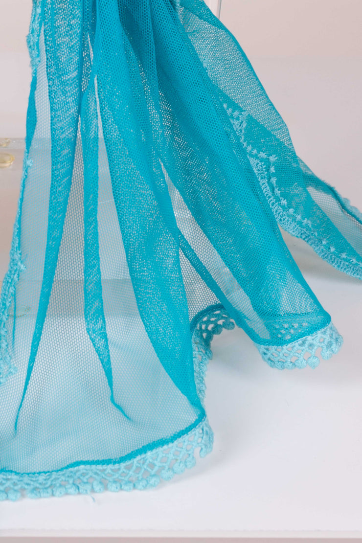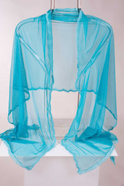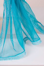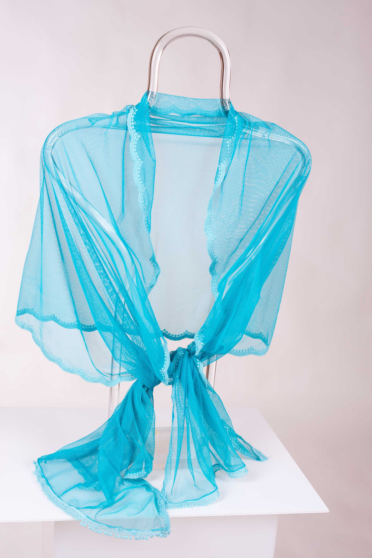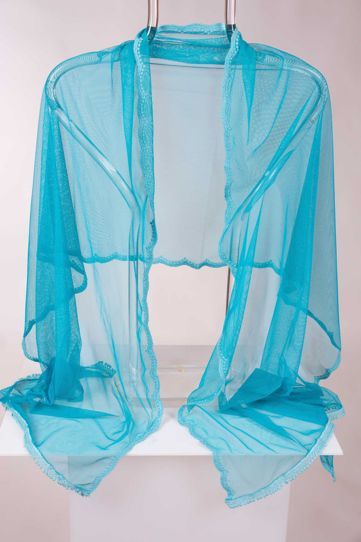 Este chal de fiesta en tul color turquesa destaca por su borde ondulado que crea un efecto de olas, aportando movimiento y elegancia. La pasamanería del mismo tono decora delicadamente el contorno, realzando su diseño y ofreciendo un complemento sofisticado y exclusivo para ocasiones especiales.