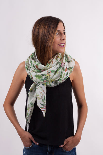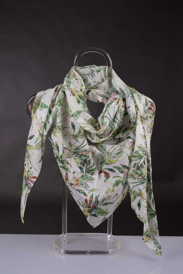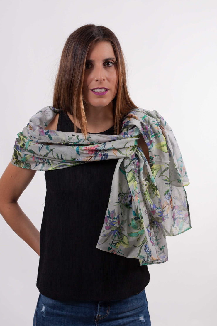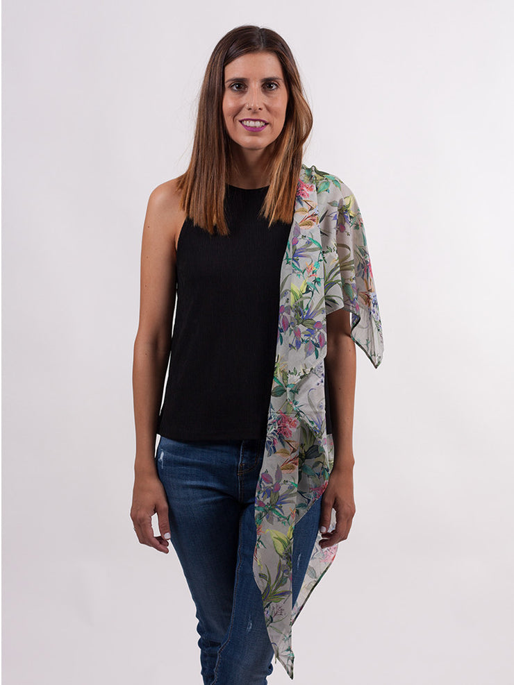 Este pañuelo y fular Lidia combina algodón y seda natural para ofrecer una textura suave y ligera, ideal para cualquier estación. Su delicado estampado floral aporta un toque elegante y versátil, disponible en fondo blanco o gris. Puedes elegir entre la forma rectangular o triangular, adaptándose a diferentes estilos y ocasiones con sofisticación y comodidad.